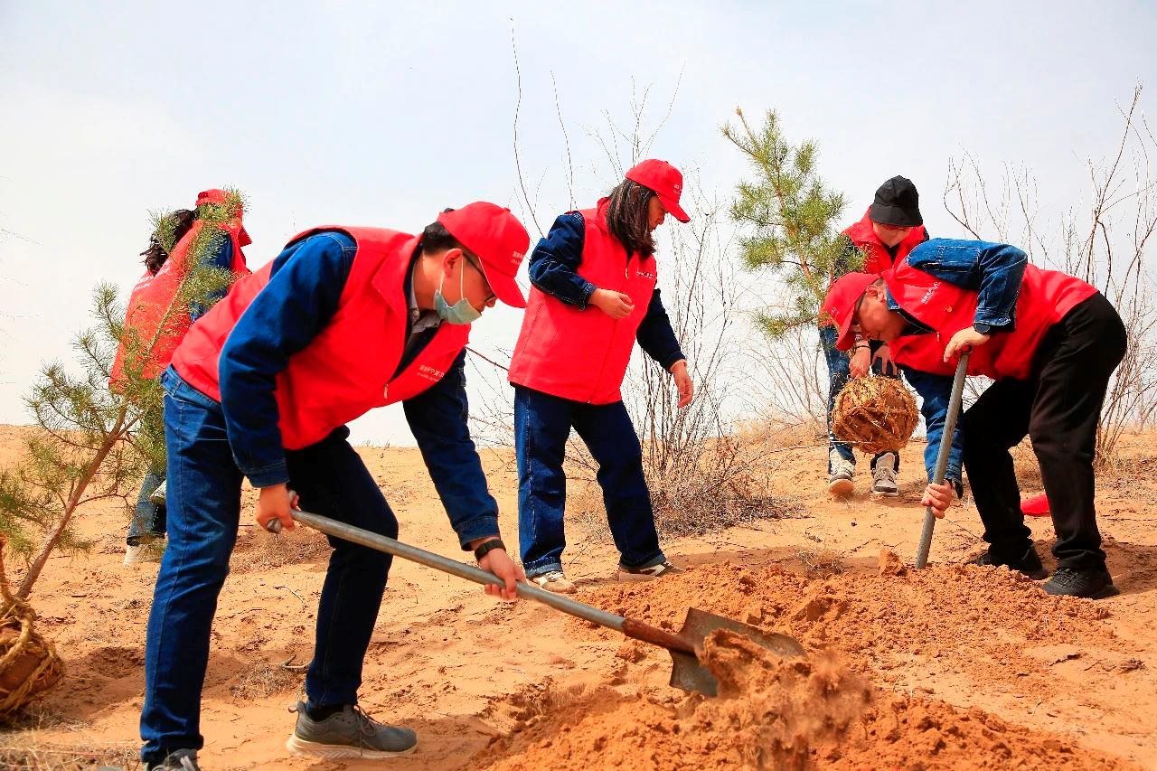 △2023年4月12日,志愿者在寧夏靈武白芨灘國(guó)家級(jí)自然保護(hù)區(qū)開展義務(wù)植樹、扎草方格。