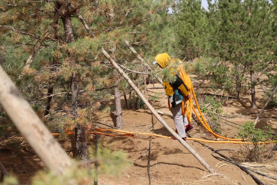 △2023年5月31日,治沙工人在庫(kù)布其沙漠億利生態(tài)治理區(qū)內(nèi)搬運(yùn)水管,準(zhǔn)備為樹木澆水。