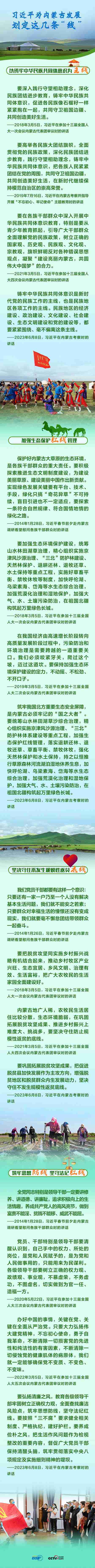 6月8日,習(xí)近平總書記聽取內(nèi)蒙古自治區(qū)黨委和政府工作匯報后發(fā)表講話,強調(diào)內(nèi)蒙古要“以鑄牢中華民族共同體意識為主線”,“加強生態(tài)保護紅線管理”,“堅決守住不發(fā)生規(guī)模性返貧底線”,“筑牢思想防線,堅守法紀(jì)紅線”。