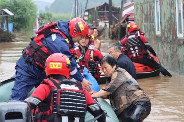 △8月4日,在黑龍江尚志市一面坡鎮(zhèn)萬山村,哈爾濱市森林消防隊(duì)員解救被困村民。