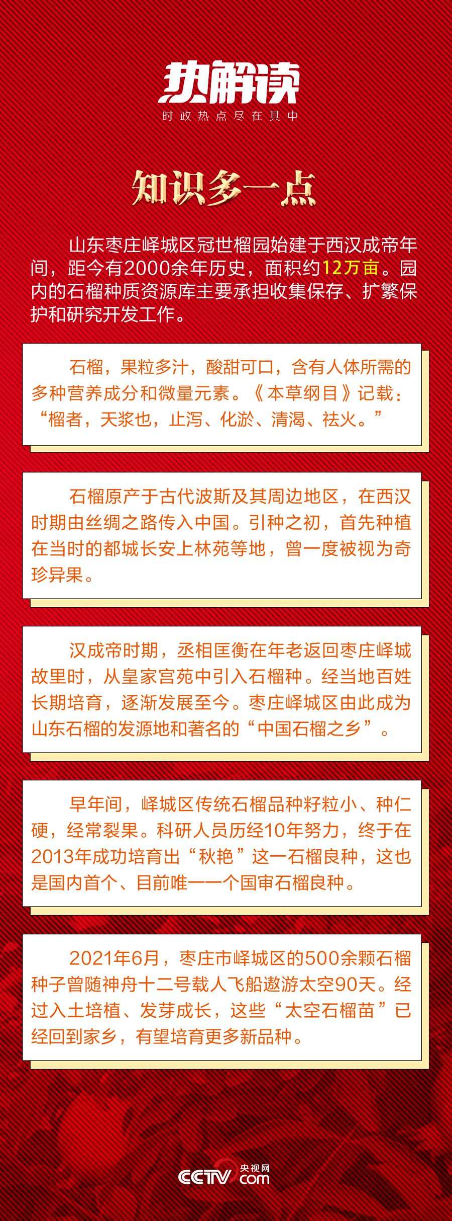 歷經(jīng)千年,當(dāng)年自異域“舶來(lái)”的奇珍異果,已經(jīng)成為遍地開花的致富果、幸福果。山東棗莊火紅的石榴給這座小城帶來(lái)了紅火的發(fā)展機(jī)遇,也給老百姓帶來(lái)了紅火的生活。