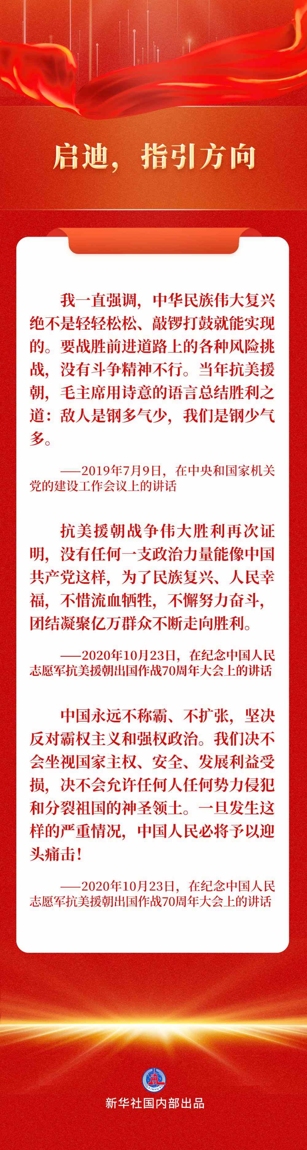 習(xí)近平總書(shū)記曾多次談起這段氣壯山河的英雄史詩(shī),深情講述這些“最可愛(ài)的人”的動(dòng)人故事,以史為鑒,為全黨全軍全國(guó)各族人民指明前行方向。