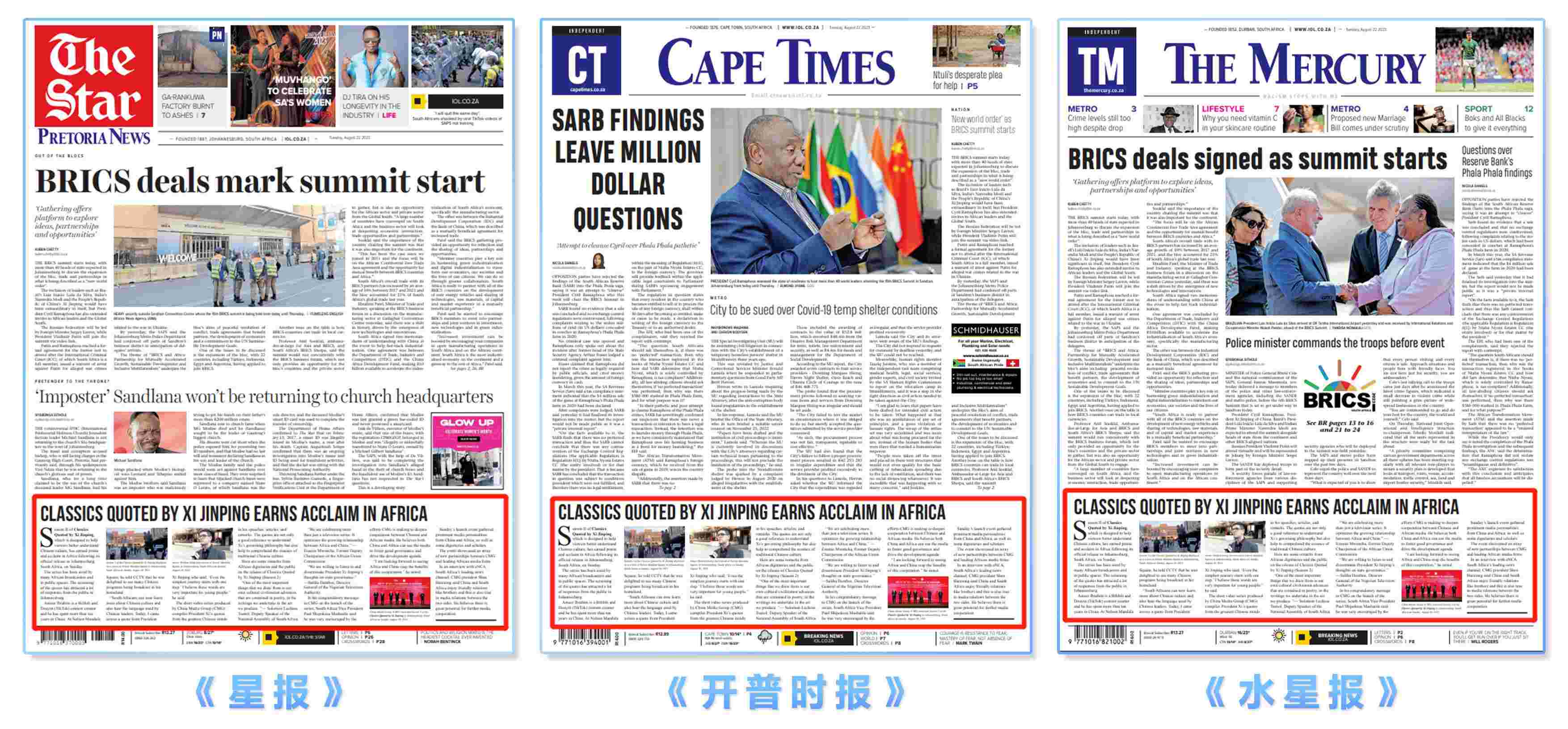 8月22日出版的南非三大主流報刊南非《星報》、《開普時報》、《水星報》,連續(xù)第二天在頭版顯著位置發(fā)表文章。文章指出,《平“語”近人——習(xí)近平喜歡的典故》第二季周日(8月20日)在南非約翰內(nèi)斯堡正式發(fā)布后,在非洲贏得了廣泛好評。系列節(jié)目已經(jīng)在多家非洲廣播公司播出,并在公共場所大屏幕展示,這些語錄吸引了大量非洲受眾觀看并獲得積極反響。