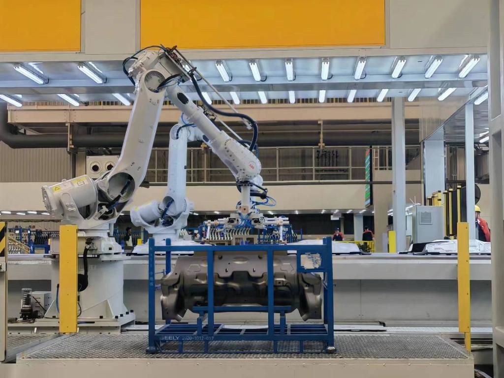 吉利汽車(chē)西安工廠(chǎng)沖壓車(chē)間機(jī)器人正在自動(dòng)抓件。新華社記者姜辰蓉 攝