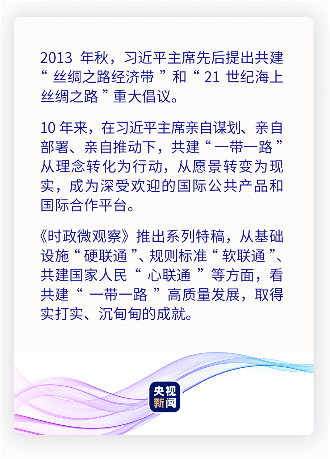 10年來,共建“一帶一路”以高標(biāo)準(zhǔn)、可持續(xù)、惠民生為目標(biāo),以規(guī)則標(biāo)準(zhǔn)“軟聯(lián)通”為重要支撐,為促進全球互聯(lián)互通、共同發(fā)展增添新動力,推動高質(zhì)量共建“一帶一路”不斷走深走實。