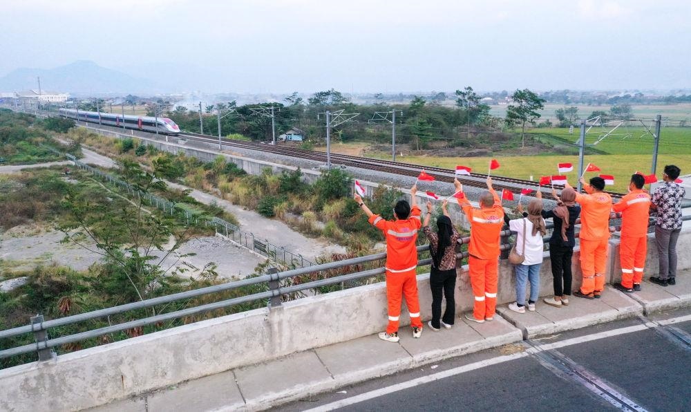 △2023年10月17日,在印度尼西亞萬隆一座天橋上,雅萬高鐵中國建設(shè)者和印尼籍員工揮舞著中國和印尼兩國國旗,向遠(yuǎn)處駛來的一列雅萬高鐵高速動車組列車歡呼。
