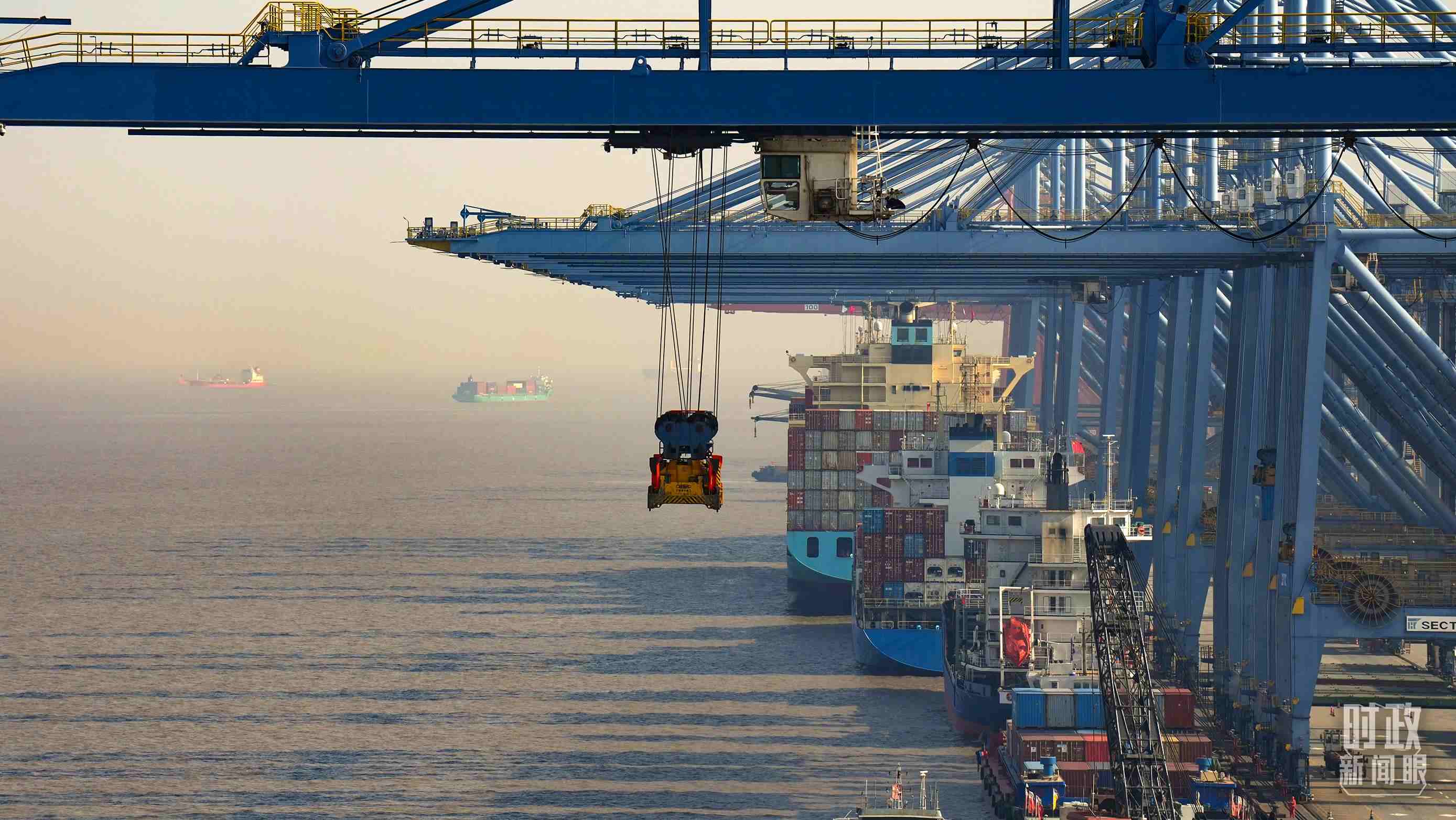 △上港集箱外高橋碼頭,巨型塔吊正在吊裝集裝箱貨柜。(總臺(tái)國廣記者李晉拍攝)