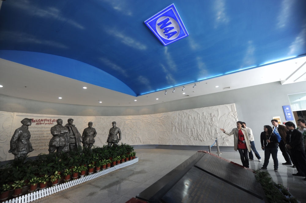 ?↑ 在鹽城新四軍紀(jì)念館,講解員在向觀眾介紹展廳入口處的浮雕和塑像(2011年5月27日攝)。