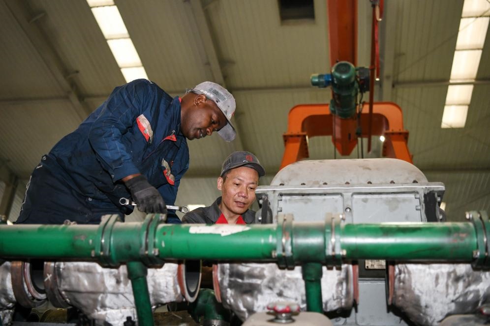 2023年7月4日,中國(guó)中車(chē)駐肯員工和肯方員工在肯尼亞內(nèi)羅畢的蒙內(nèi)鐵路機(jī)車(chē)維保車(chē)間工作。
