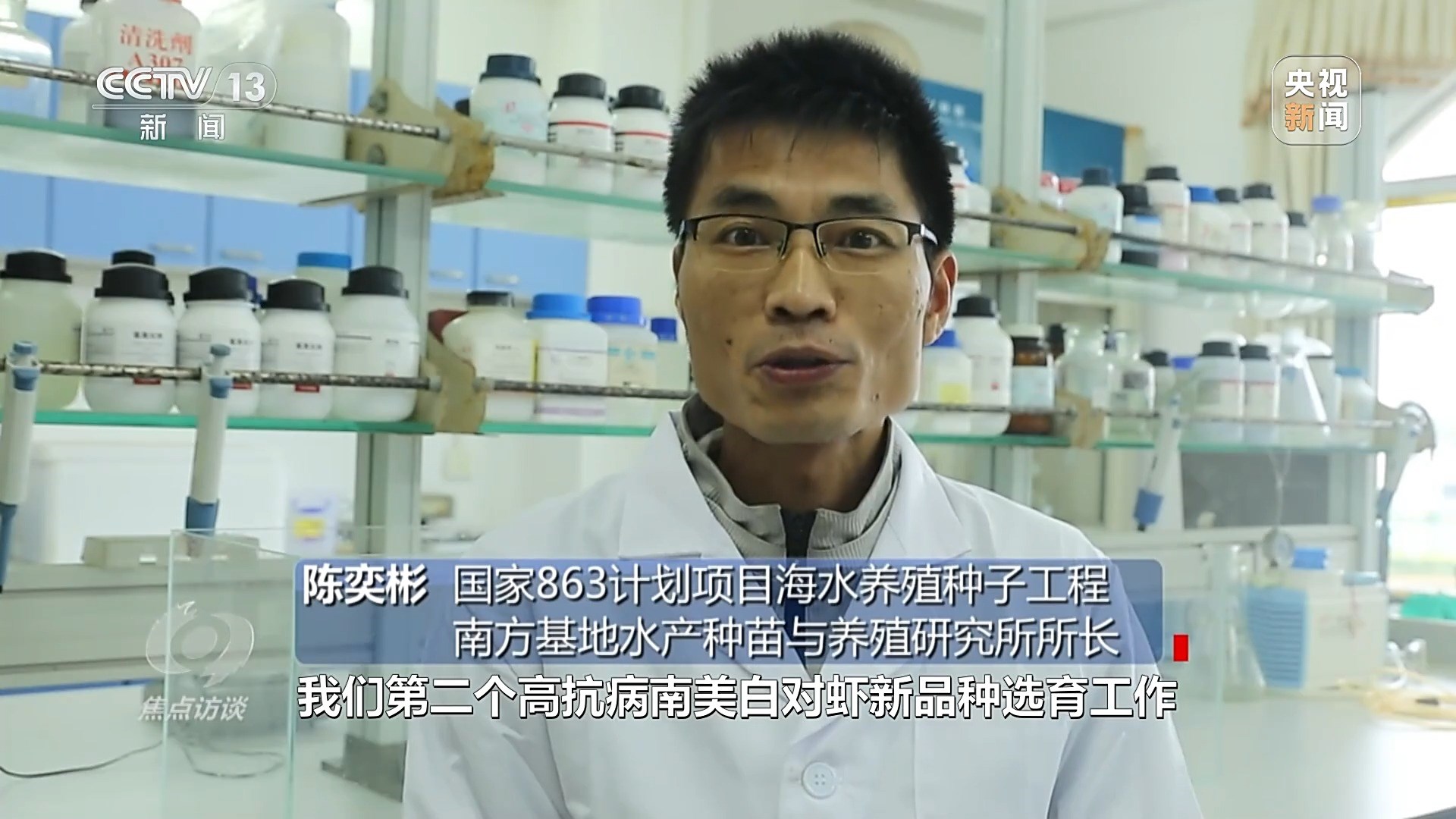 陳奕彬:“我們第二個高抗病南美白對蝦新品種選育工作,取得了關(guān)鍵性突破,讓人很振奮。2023年,還有一件令我更振奮的事情,就是習(xí)總書記來我們基地,我見到了總書記?!?/p>