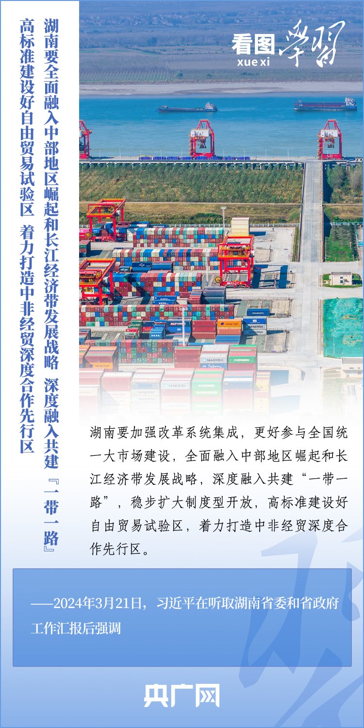 3月18日至21日,習近平總書記考察湖南長沙、常德等地,深入學校、企業(yè)、歷史文化街區(qū)、鄉(xiāng)村等進行調(diào)研??倳洀娬{(diào),湖南要牢牢把握自身在構(gòu)建新發(fā)展格局中的戰(zhàn)略定位,堅持穩(wěn)中求進工作總基調(diào),堅持高質(zhì)量發(fā)展不動搖,堅持改革創(chuàng)新、求真務(wù)實,在打造國家重要先進制造業(yè)高地、具有核心競爭力的科技創(chuàng)新高地、內(nèi)陸地區(qū)改革開放高地上持續(xù)用力,在推動中部地區(qū)崛起和長江經(jīng)濟帶發(fā)展中奮勇爭先,奮力譜寫中國式現(xiàn)代化湖南篇章。一起來學習!