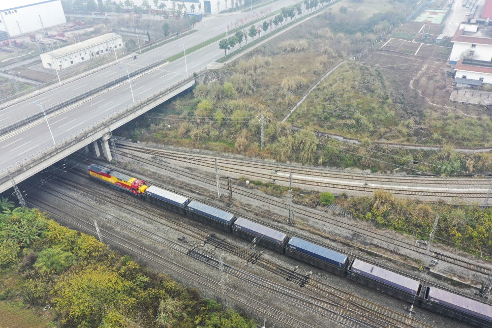 2023年1月22日,一趟西部陸海新通道鐵海聯(lián)運班列從重慶團結村中心站發(fā)車(無人機照片)。班列滿載著汽車、摩托車、發(fā)動機和純堿等共計100個集裝箱的貨物,將經廣西欽州港換乘海船去往印度尼西亞、菲律賓、喀麥隆、澳大利亞等國家和地區(qū)。