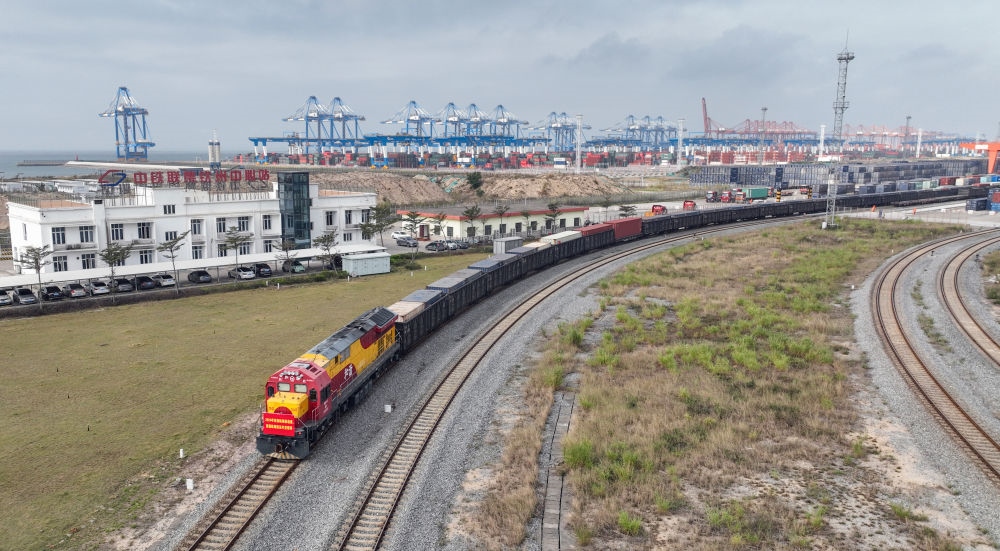 2024年1月19日,滿載東盟國家商品的年貨班列駛出廣西欽州港東站,開往重慶團結村站和成都城廂站。