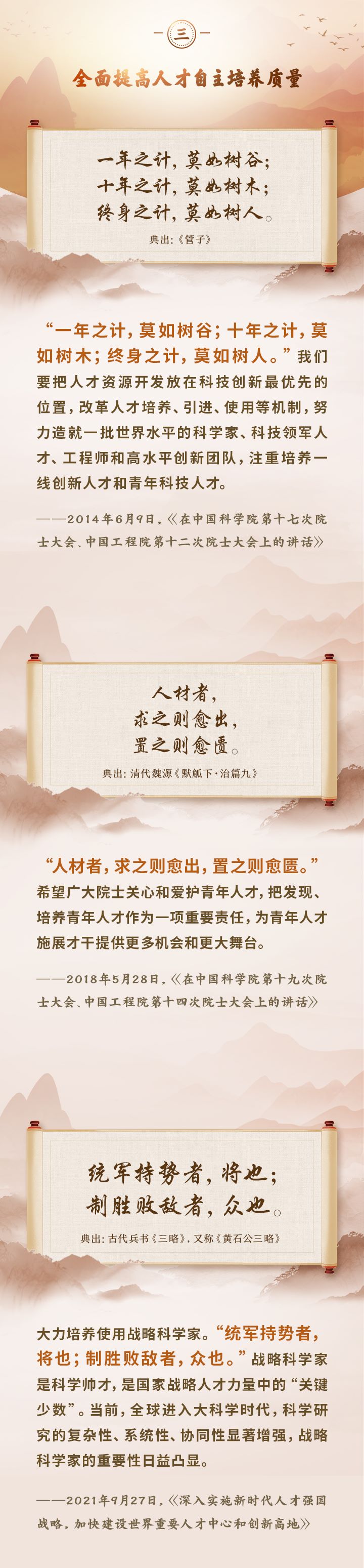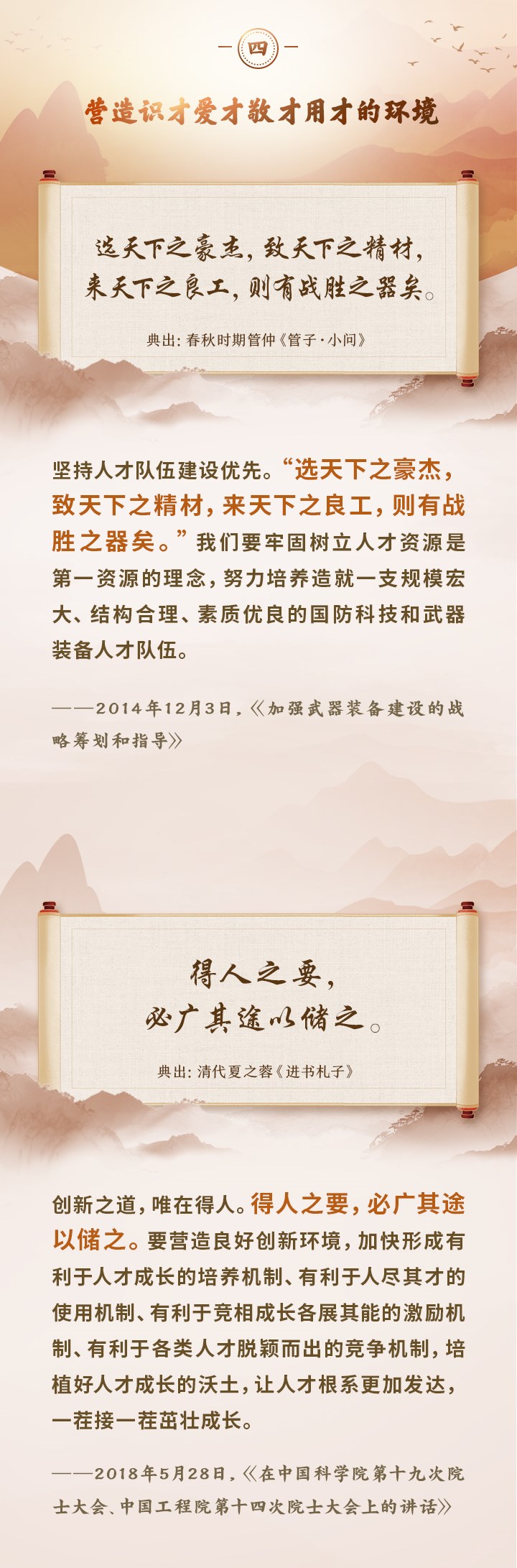 編者按:培養(yǎng)造就大批德才兼?zhèn)涞母咚刭|(zhì)人才,是國(guó)家和民族長(zhǎng)遠(yuǎn)發(fā)展大計(jì)。黨的十八大以來(lái),習(xí)近平總書記圍繞人才工作發(fā)表一系列重要論述,立意高遠(yuǎn),內(nèi)涵豐富,思想深刻,深刻回答了為什么建設(shè)人才強(qiáng)國(guó)、什么是人才強(qiáng)國(guó)、怎樣建設(shè)人才強(qiáng)國(guó)的重大理論和實(shí)踐問題。在這些重要論述中,總書記精妙運(yùn)用古代典籍、經(jīng)典名句,以古喻今、啟迪思想、激蕩精神,讓我們一起來(lái)學(xué)習(xí)!