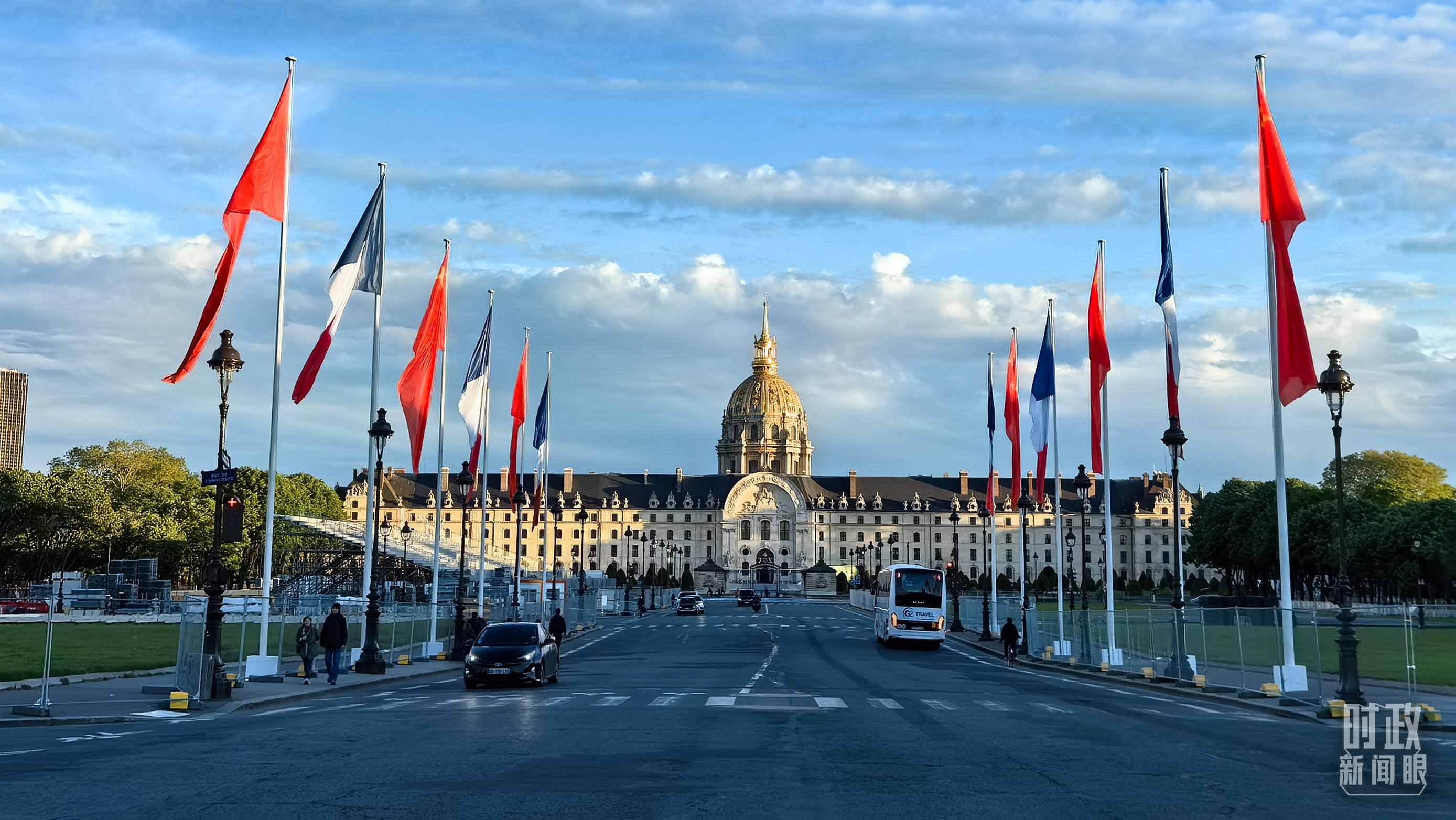 △法國巴黎榮軍院前懸掛中法兩國國旗。(總臺國廣記者吳倩拍攝)