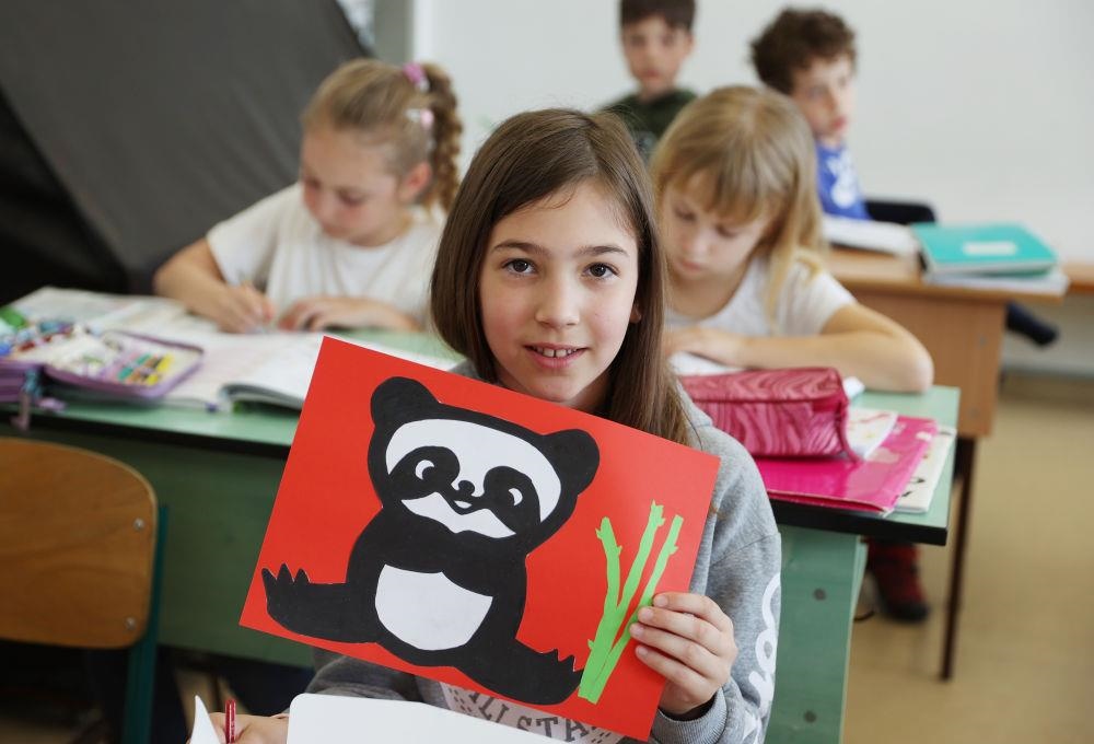 △2024年5月3日,匈中雙語學(xué)校三年級學(xué)生寶怡展示自己的大熊貓形象美術(shù)作品。