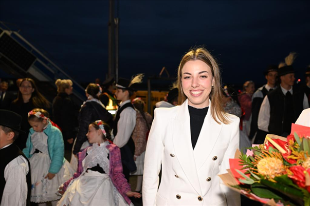 當(dāng)?shù)貢r間5月8日晚,在匈牙利布達佩斯國際機場歡迎隊伍中的匈牙利姑娘歐拉·塔瑪拉。新華社記者 謝環(huán)馳 攝