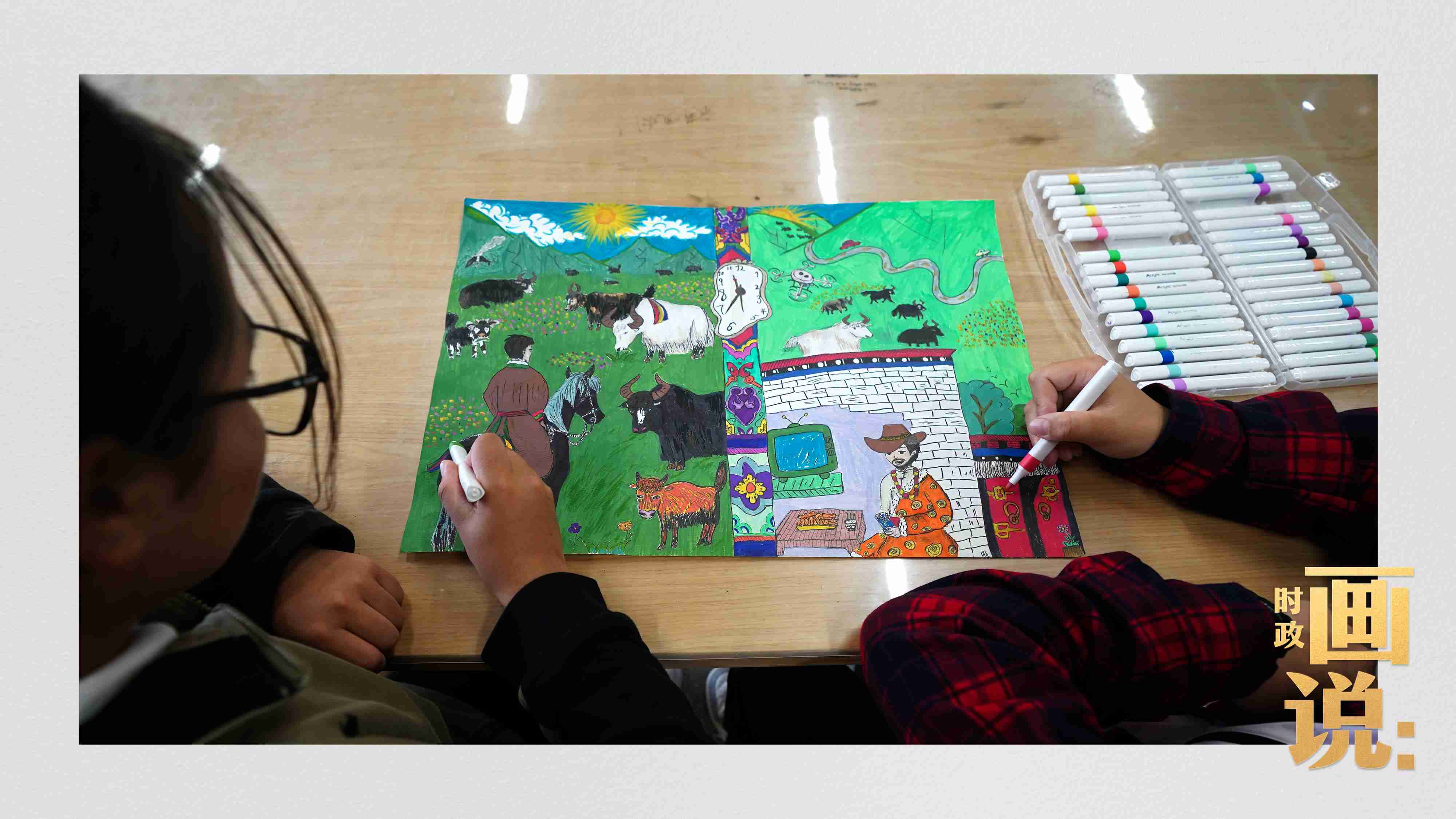△高一(1)班學(xué)生肉昂吉和才央措姐妹一起描繪家鄉(xiāng)果洛的新變化。