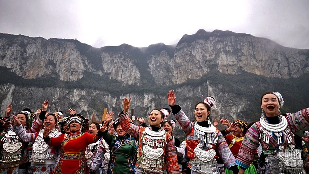 △2021年2月,習(xí)近平總書(shū)記來(lái)到貴州化屋村考察,當(dāng)?shù)卮迕裼脷g快的苗家歌舞迎接總書(shū)記。(總臺(tái)央視記者王哈男拍攝)