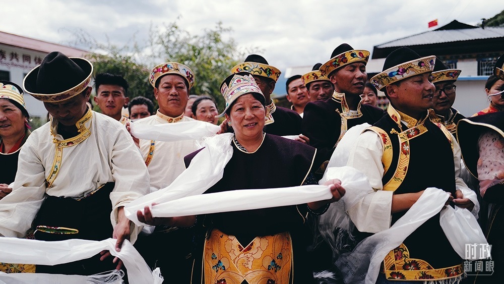 △2021年7月,習(xí)近平總書(shū)記來(lái)到西藏林芝市嘎拉村考察。村民們手捧哈達(dá),熱情迎接。(總臺(tái)央視記者彭漢明拍攝)