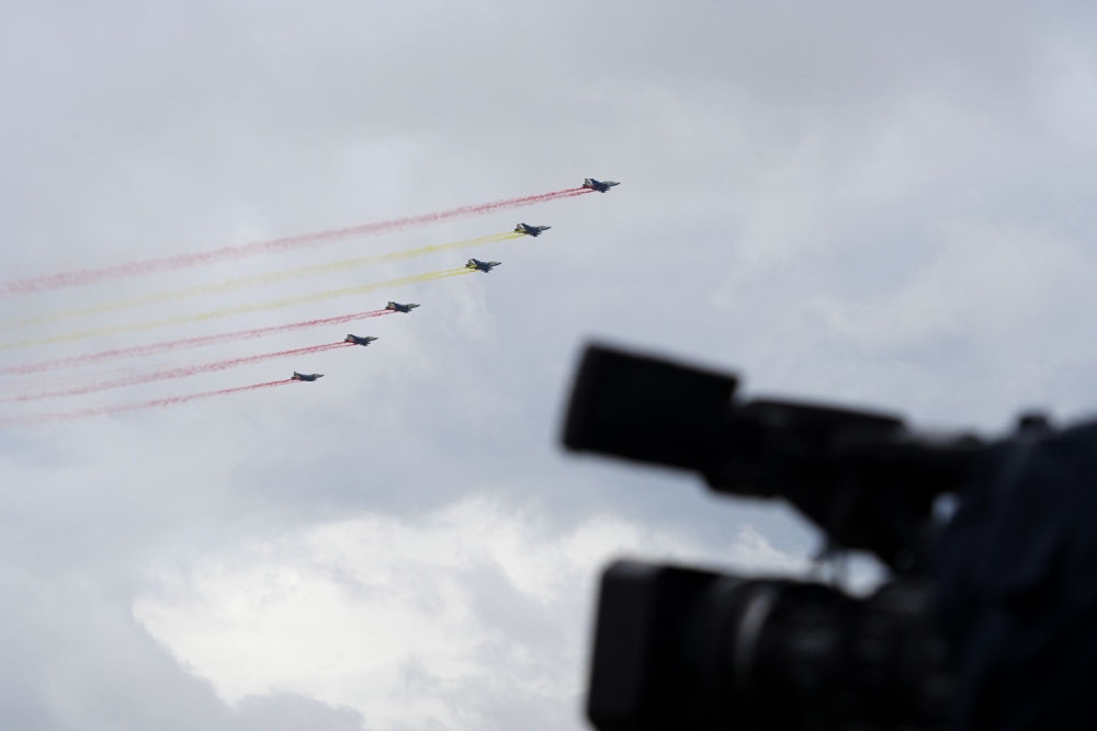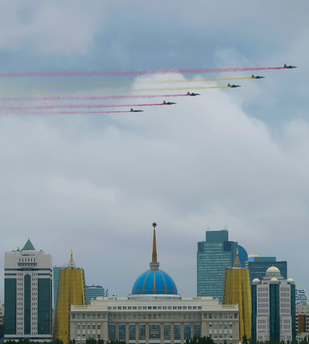 習(xí)近平主席抵達(dá)時(shí),哈方多架戰(zhàn)機(jī)在總統(tǒng)府上空拉出中國國旗色彩煙歡迎中國貴賓。