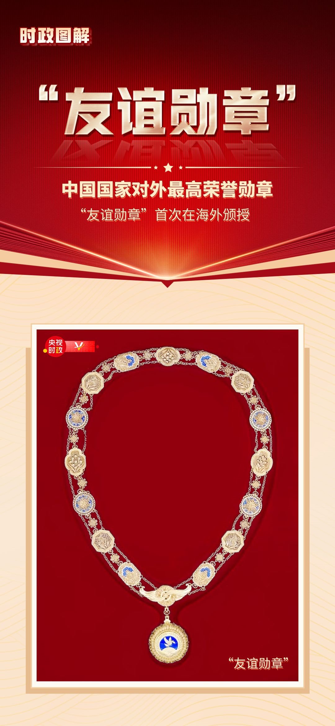 “友誼勛章”是中國(guó)國(guó)家對(duì)外最高榮譽(yù)勛章,授予在支持中國(guó)現(xiàn)代化建設(shè)、促進(jìn)中外交流合作、維護(hù)世界和平中作出杰出貢獻(xiàn)的外國(guó)友人。