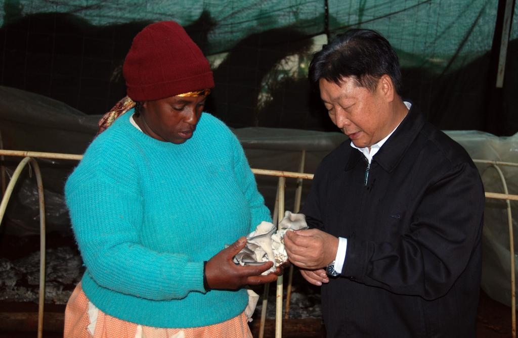 2007年10月4日,在南非東南部山區(qū),林占熺(右)指導(dǎo)當(dāng)?shù)貗D女種植蘑菇。 新華社記者 陳銘 攝
