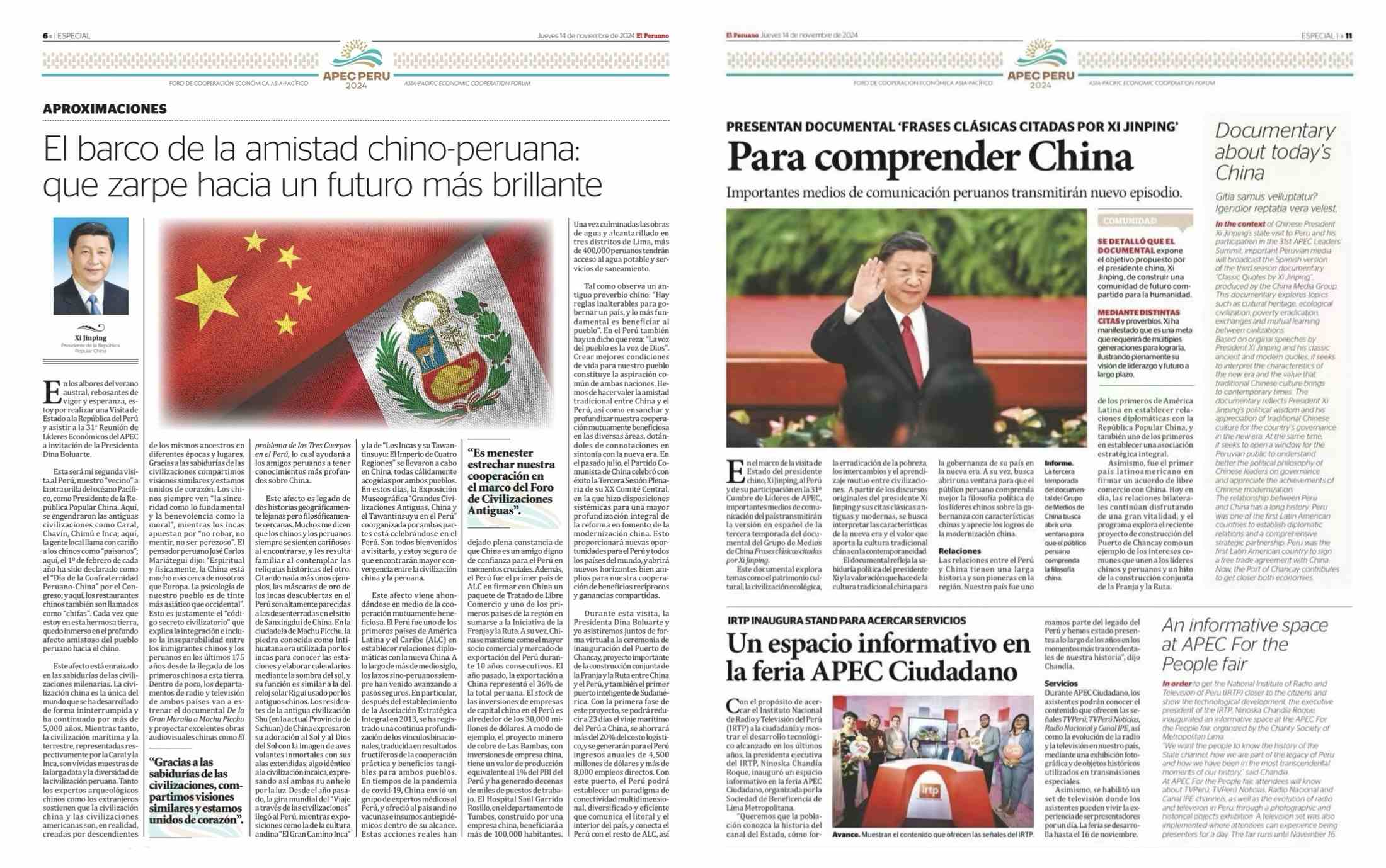 在中國國家主席習近平應(yīng)秘魯共和國總統(tǒng)博魯阿爾特邀請,赴利馬出席亞太經(jīng)合組織第三十一次領(lǐng)導(dǎo)人非正式會議并對秘魯進行國事訪問之際,由中國中央廣播電視總臺制作的《平“語”近人——習近平喜歡的典故》第三季(西班牙語版),將于當?shù)貢r間11月14日起在秘魯國家廣播電視臺、秘魯電視聯(lián)播網(wǎng)、秘魯廣播節(jié)目集團電視端等多平臺落地播出。當?shù)囟嗉抑髁髅襟w對節(jié)目落播進行預(yù)告,引發(fā)秘魯各界普遍期待和廣泛關(guān)注。