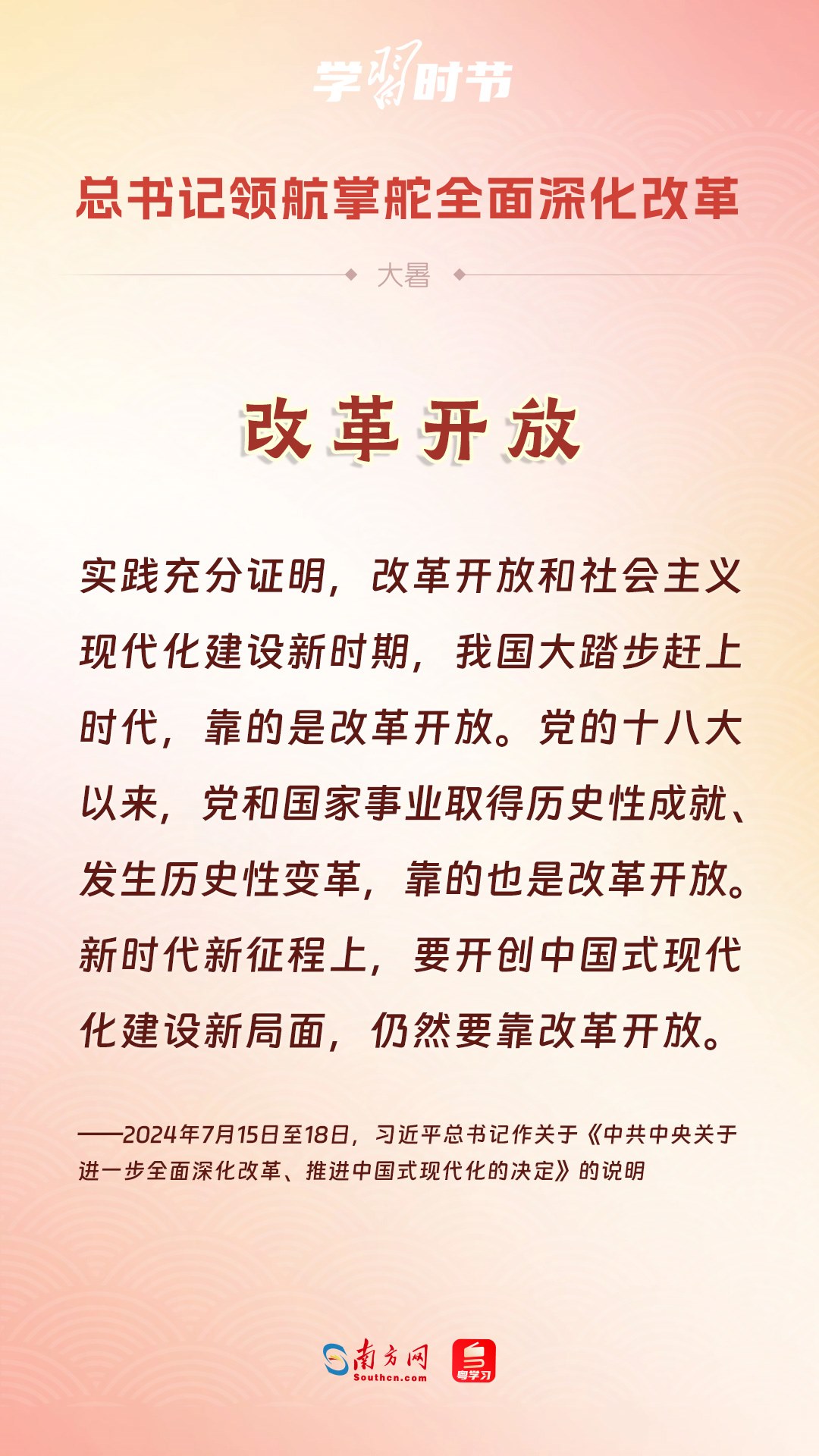 我們隆重慶祝新中國成立75周年,深情回望共和國的滄桑巨變。從五千多年中華文明的傳承中一路走來,“中國”二字鐫刻在“何尊”底部,更銘刻在每個華夏兒女心中。黨的二十屆三中全會勝利召開,吹響進一步全面深化改革的號角。我們乘著改革開放的時代大潮闊步前行,中國式現(xiàn)代化必將在改革開放中開辟更加廣闊的前景。