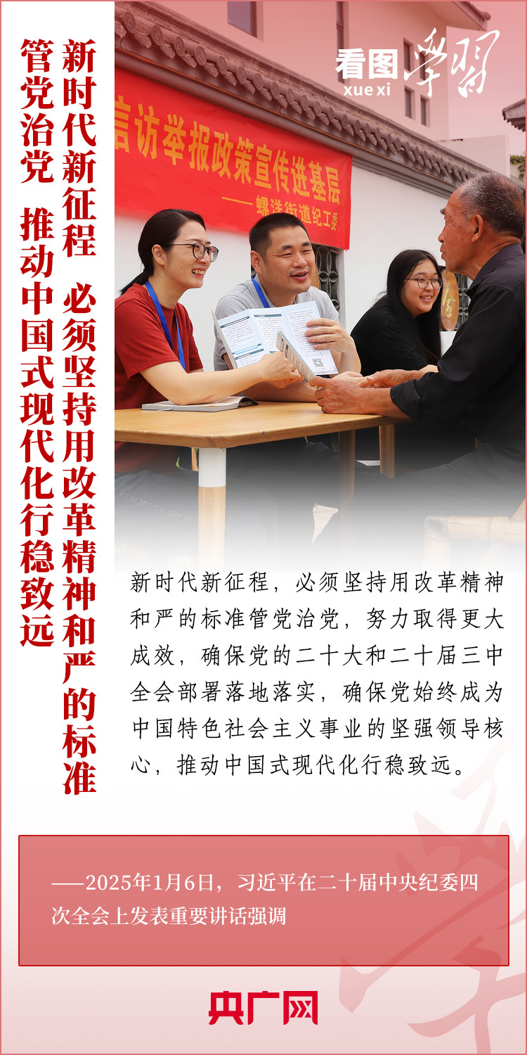 1月6日,習(xí)近平總書記在二十屆中央紀(jì)委四次全會上發(fā)表重要講話,充分肯定過去一年全面從嚴(yán)治黨取得的新進(jìn)展、新成效,深刻分析當(dāng)前反腐敗斗爭形勢,對堅(jiān)決打好反腐敗斗爭攻堅(jiān)戰(zhàn)、持久戰(zhàn)、總體戰(zhàn)提出明確要求??倳洀?qiáng)調(diào),新時(shí)代新征程,必須堅(jiān)持用改革精神和嚴(yán)的標(biāo)準(zhǔn)管黨治黨,努力取得更大成效,確保黨的二十大和二十屆三中全會部署落地落實(shí),確保黨始終成為中國特色社會主義事業(yè)的堅(jiān)強(qiáng)領(lǐng)導(dǎo)核心,推動中國式現(xiàn)代化行穩(wěn)致遠(yuǎn)。一起來學(xué)習(xí)!