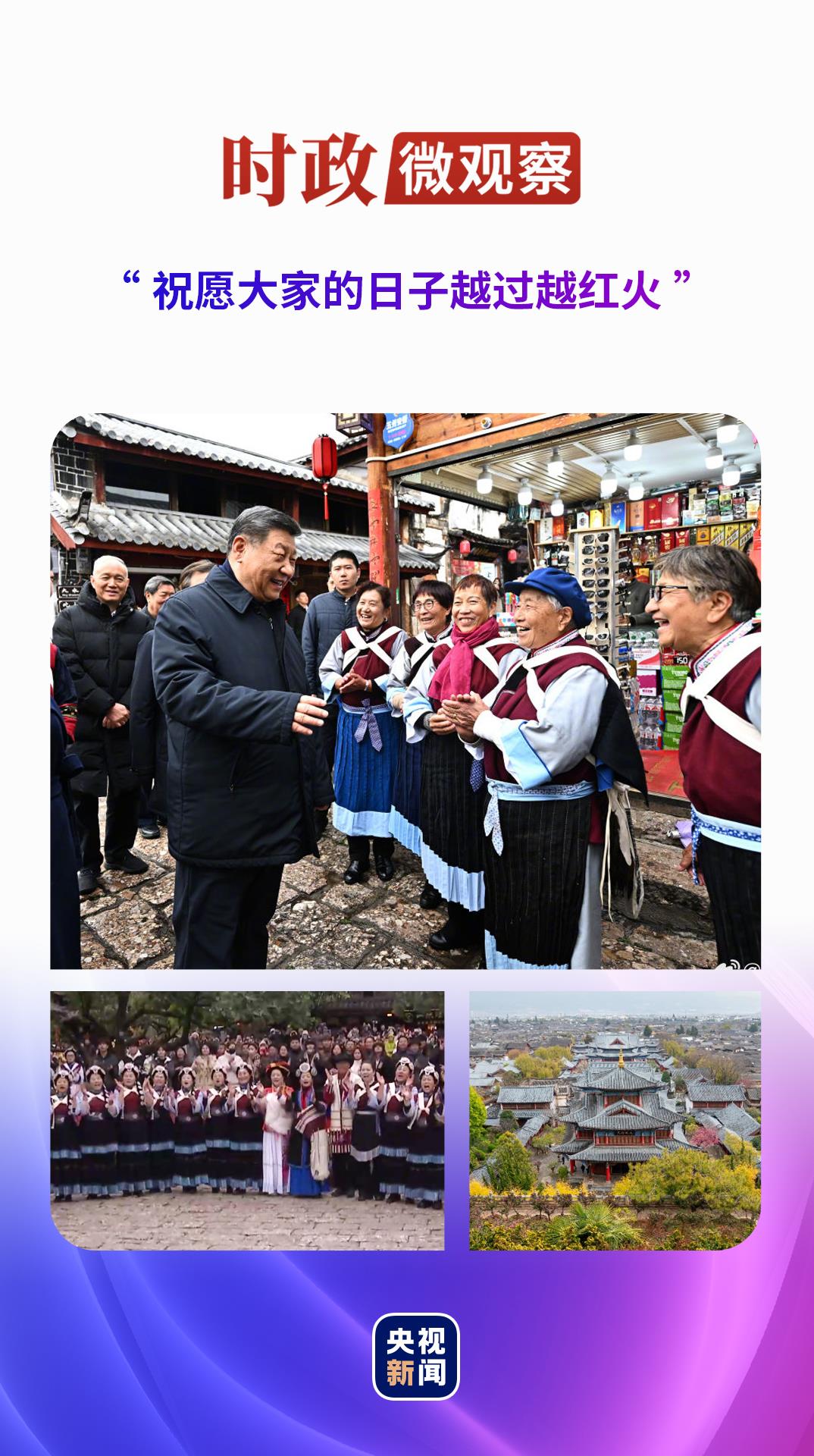 今年3月19日,習近平總書記再次來到云南考察,在麗江古城沿著石板路邊走邊看,不時停下腳步同大家親切交流。古城居民和游客見到總書記十分興奮,爭相問好,有的還彈奏樂器、載歌載舞歡迎總書記。習近平總書記祝福大家,“希望你們的生活幸福安康,就像納西族的大姓‘和’姓一樣,和和美美”。