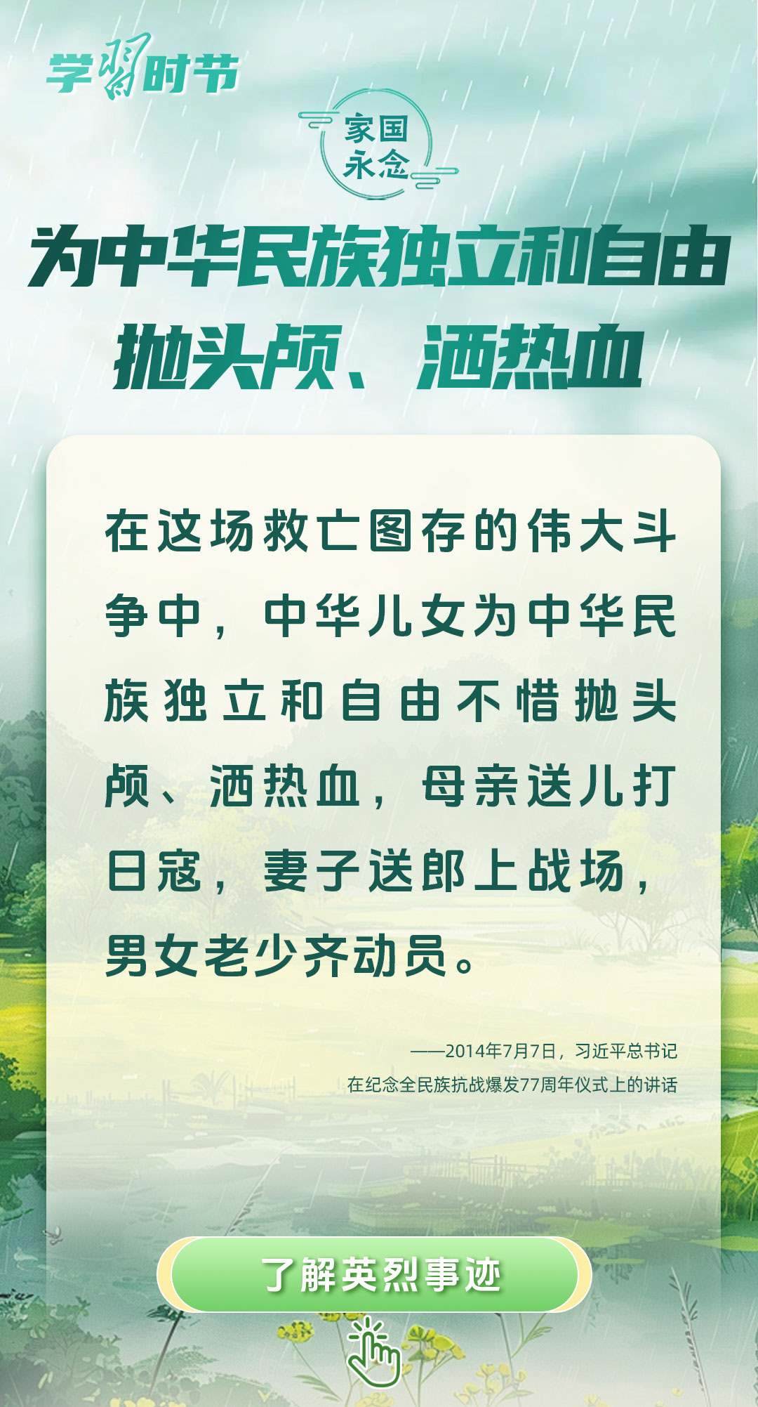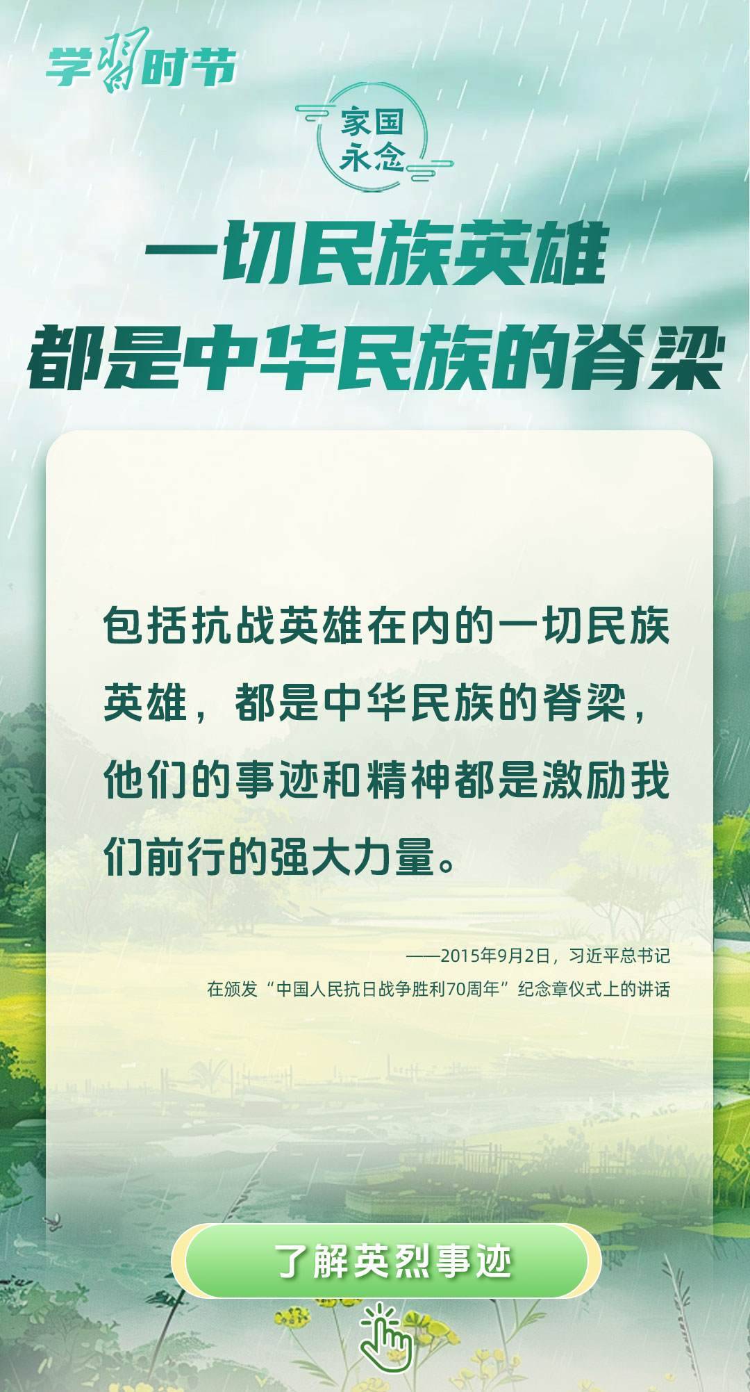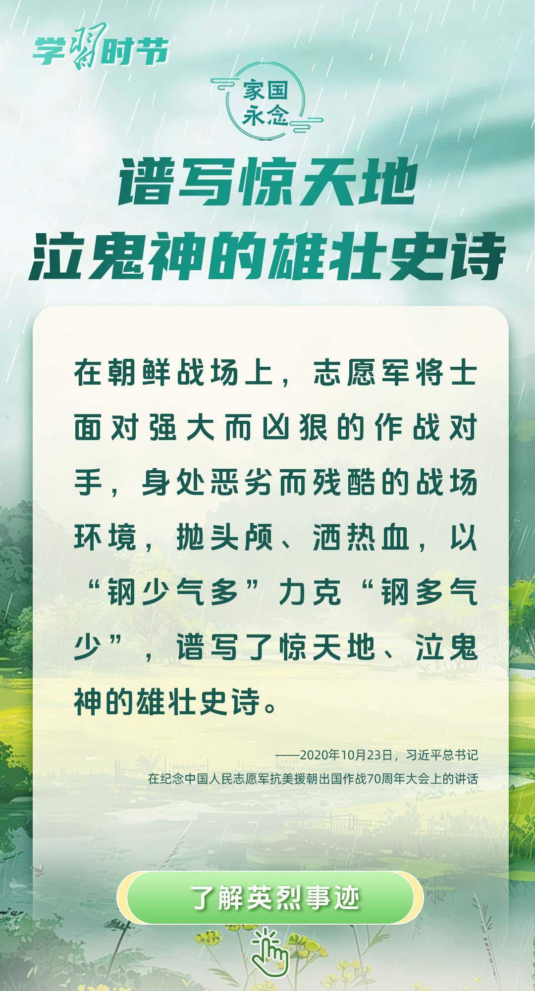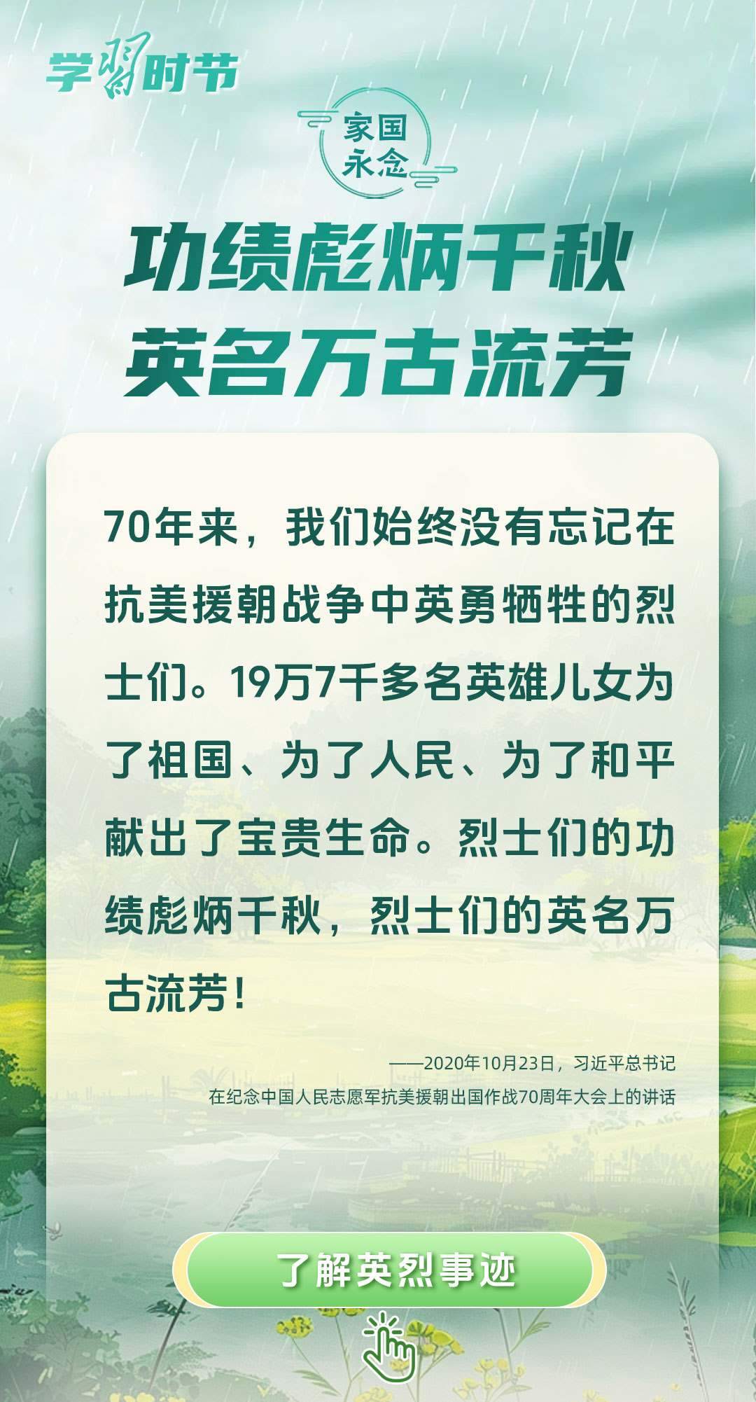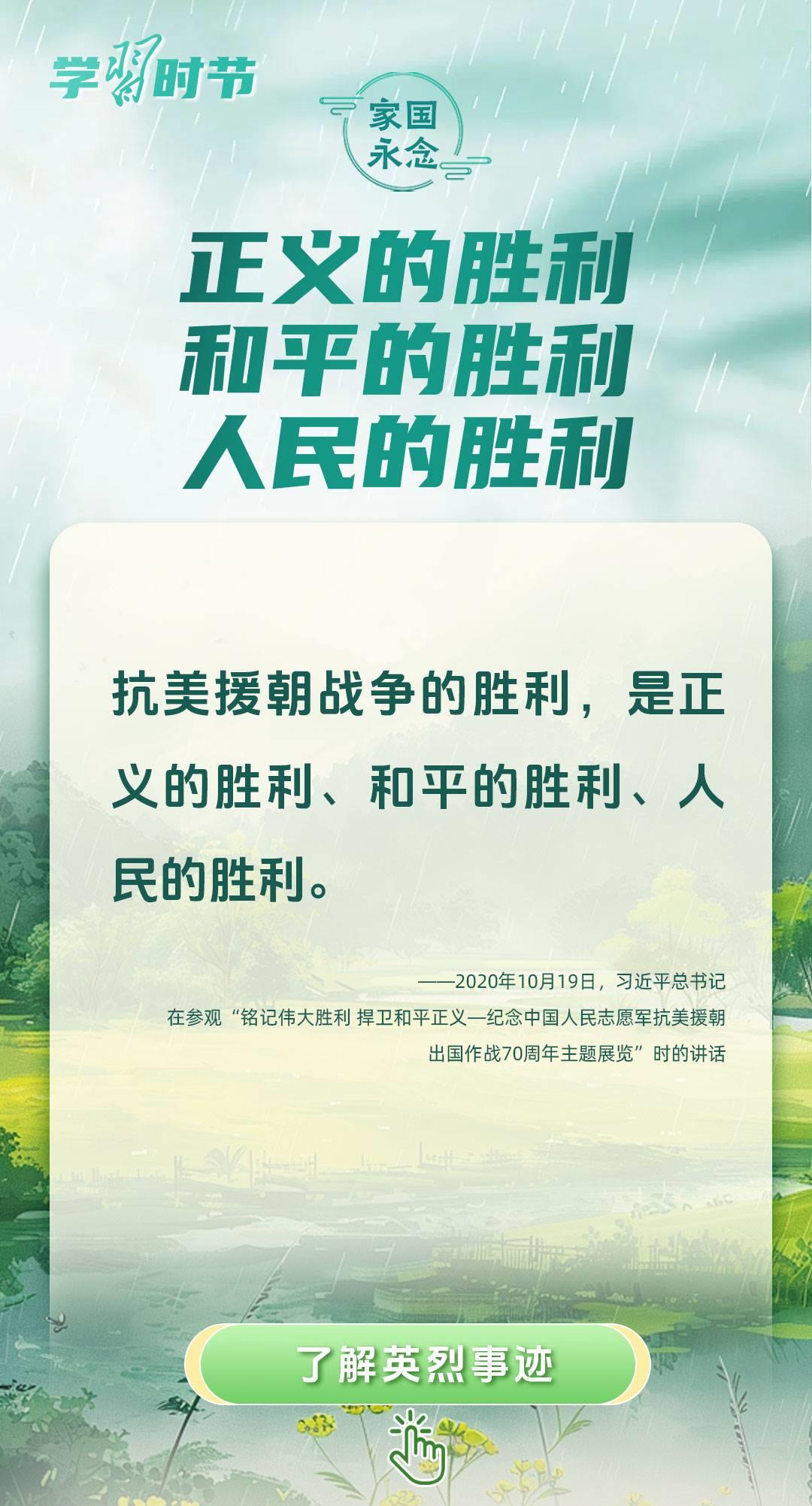 今年是中國(guó)人民抗日戰(zhàn)爭(zhēng)暨世界反法西斯戰(zhàn)爭(zhēng)勝利80周年、中國(guó)人民志愿軍抗美援朝出國(guó)作戰(zhàn)75周年。習(xí)近平總書記曾說(shuō):“對(duì)一切為國(guó)家、為民族、為和平付出寶貴生命的人們,不管時(shí)代怎樣變化,我們都要永遠(yuǎn)銘記他們的犧牲和奉獻(xiàn)?!苯裉煳覀兯鶕碛械囊磺校瑹o(wú)不凝結(jié)著英雄、英烈們的奉獻(xiàn)付出乃至巨大犧牲。