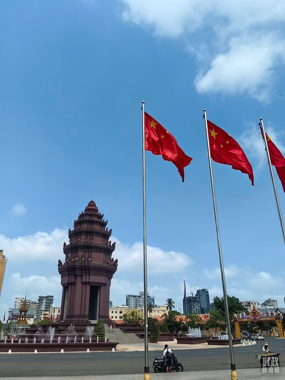 △柬埔寨獨(dú)立紀(jì)念碑前懸掛的中國(guó)國(guó)旗。(總臺(tái)央視記者段德文拍攝)