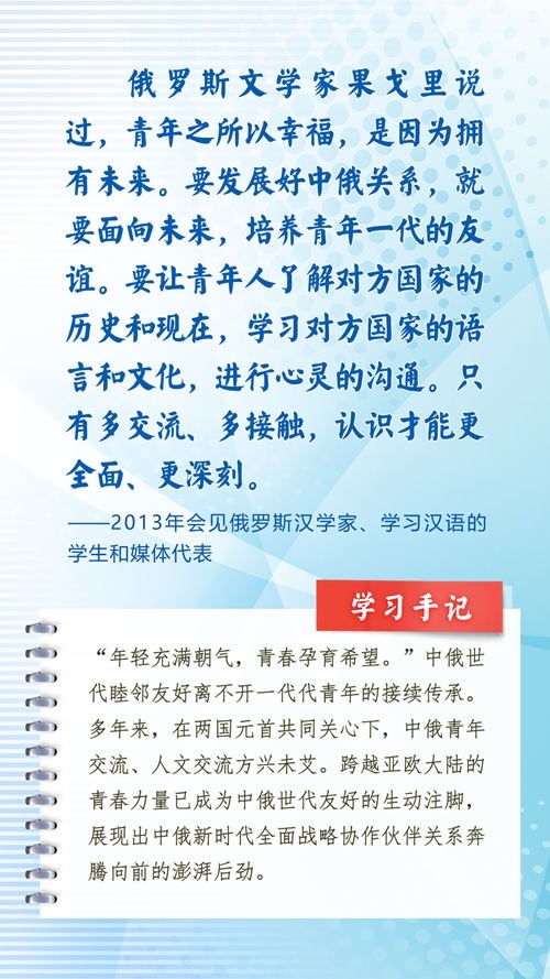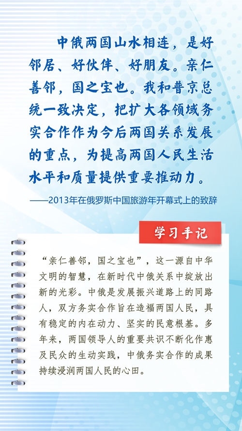 我們一起來(lái)學(xué)習(xí)品讀這些飽含哲思的論述,從中感悟新時(shí)代中俄關(guān)系在復(fù)雜的外部環(huán)境下堅(jiān)毅前行之道,感悟習(xí)近平主席作為大黨大國(guó)領(lǐng)袖、世界級(jí)領(lǐng)袖的時(shí)代擔(dān)當(dāng)與天下情懷。