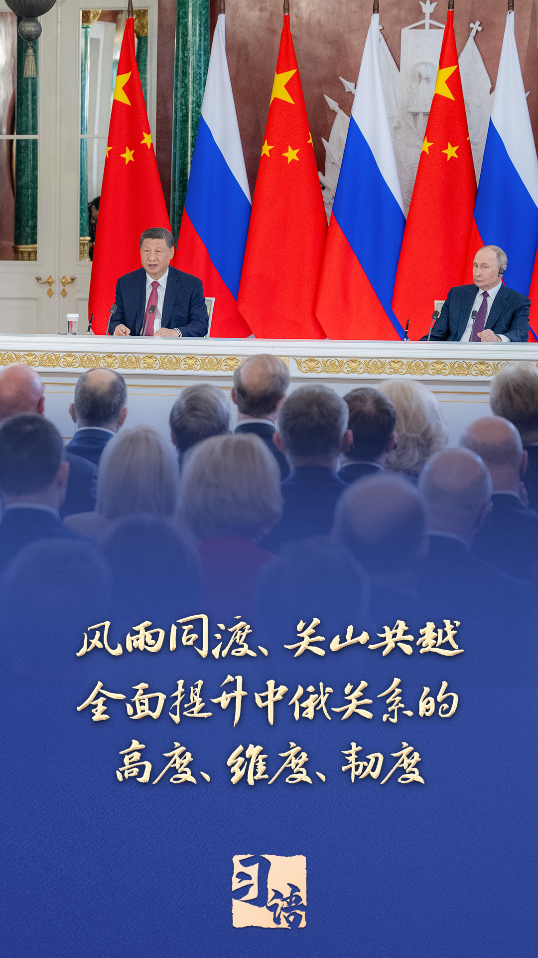 “面對變亂交織的國際形勢,中俄兩國要堅定秉持永久睦鄰友好、全面戰(zhàn)略協(xié)作、互利合作共贏精神,風(fēng)雨同渡、關(guān)山共越,全面提升中俄關(guān)系的高度、維度、韌度,為世界和平和安全注入更多穩(wěn)定性,為全球發(fā)展繁榮提供更強推動力?!碑?dāng)?shù)貢r間5月8日,習(xí)近平在同俄羅斯總統(tǒng)普京共同會見記者時指出。