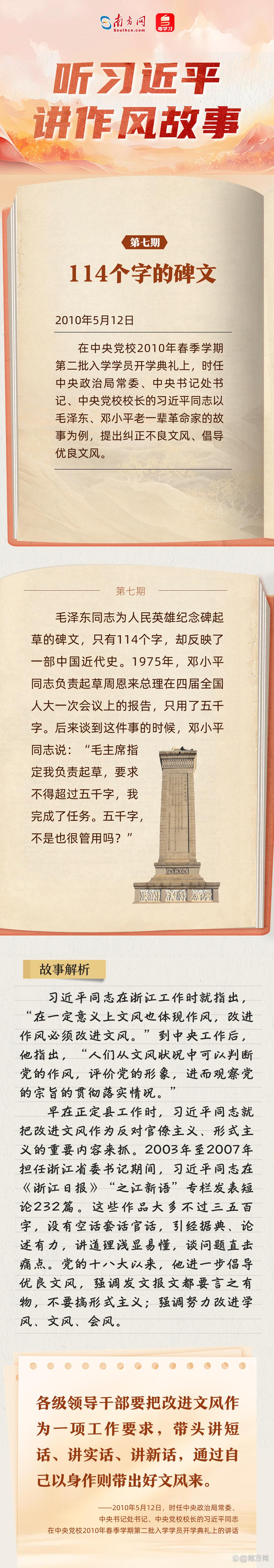 當(dāng)前,全黨上下正在開展深入貫徹中央八項規(guī)定精神學(xué)習(xí)教育,縱深推進(jìn)作風(fēng)建設(shè)。關(guān)于作風(fēng)建設(shè),習(xí)近平總書記常用講故事的方式,傳達(dá)深意、感染他人,給人以思想啟迪。南方網(wǎng)、粵學(xué)習(xí)客戶端推出“聽習(xí)近平講作風(fēng)故事”系列報道,與您一起感悟這些故事蘊(yùn)含的深刻道理。 今天,推出《聽習(xí)近平講作風(fēng)故事⑦丨114個字的碑文》,與您一起學(xué)習(xí)毛澤東、鄧小平老一輩革命家的文風(fēng)。