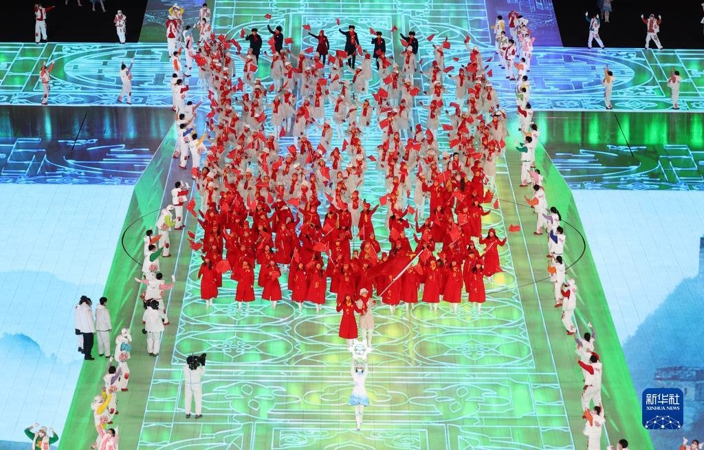 這是中國(guó)代表團(tuán)在開(kāi)幕式上入場(chǎng)。