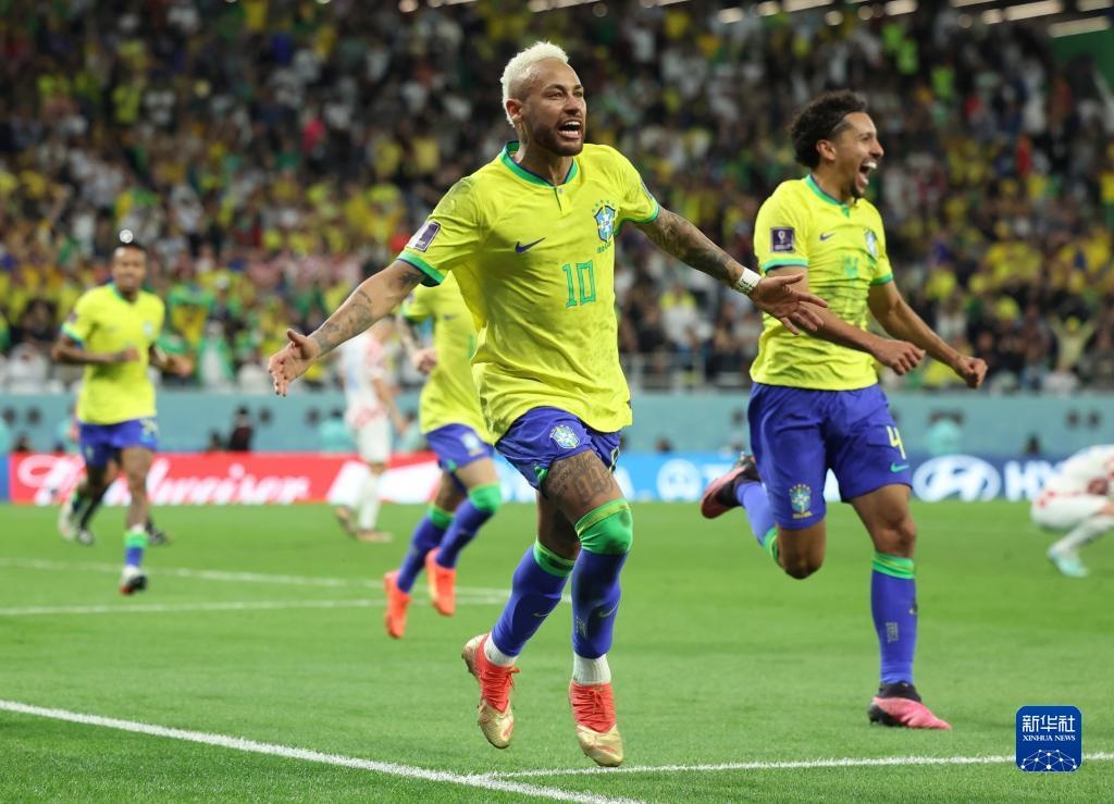 12月9日,巴西隊(duì)球員內(nèi)馬爾(右二)在比賽中突破克羅地亞隊(duì)守門(mén)員利瓦科維奇(右三)的防守后射門(mén)得分。新華社記者 蘭紅光 攝