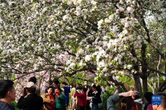 3月21日,在濟(jì)南市五龍?zhí)豆珗@,人們在觀賞盛開的海棠花。