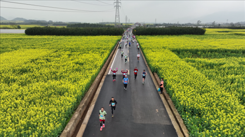 來自海內(nèi)外的1萬余名專業(yè)運動員和馬拉松愛好者在云南羅平縣的花海中奔跑。何新文攝