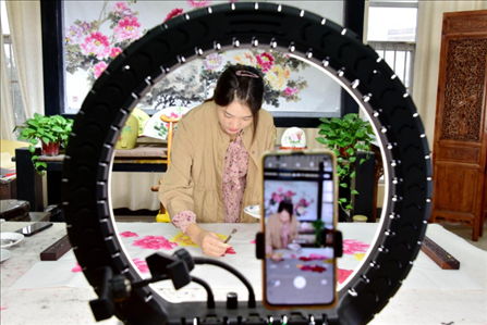 河南省洛陽市孟津區(qū)平樂鎮(zhèn)中國牡丹畫創(chuàng)意園區(qū),村民正在通過網(wǎng)絡直播推介牡丹畫。李衛(wèi)超攝