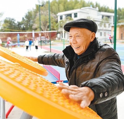 湖北省通城縣馬港鎮(zhèn)九嶺村李家屋場(chǎng),村民使用體育運(yùn)動(dòng)器材健身。劉建平攝(影像中國(guó))