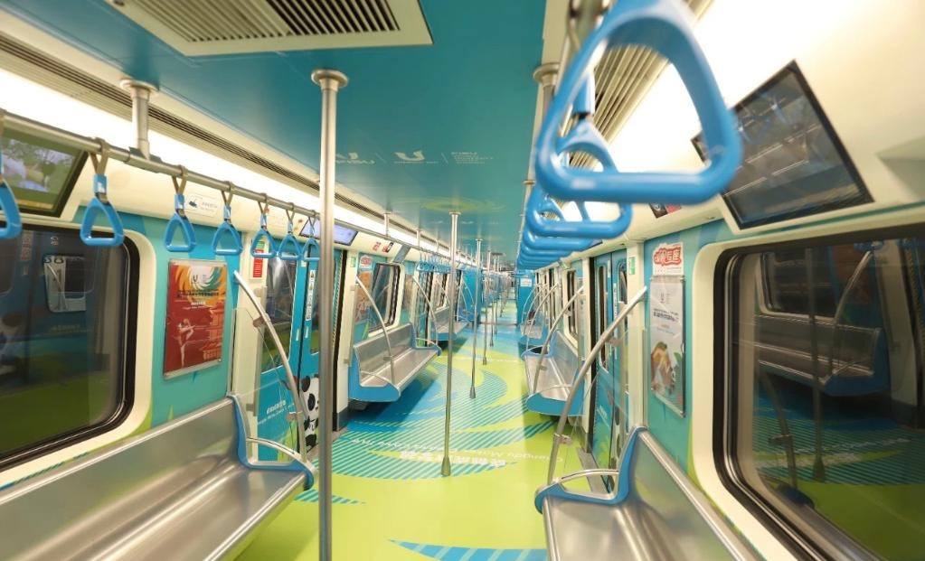 整體車廂打造創(chuàng)新植入了色彩明快、充滿青春氣息的“移動運動場”概念,立面畫面則結(jié)合青春動感的大學(xué)生形象,并選用田徑、網(wǎng)球、籃球、體操等運動的代表性動作為設(shè)計元素,全面凸顯成都大運會賽事核心主題。