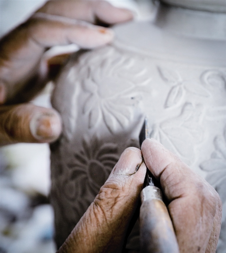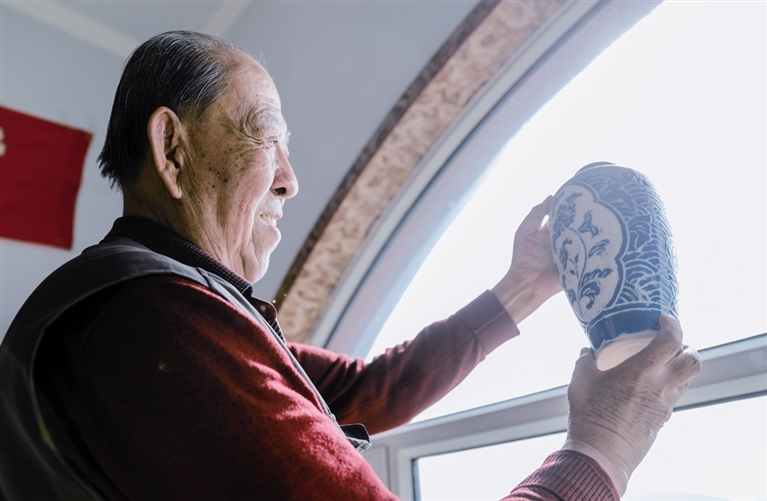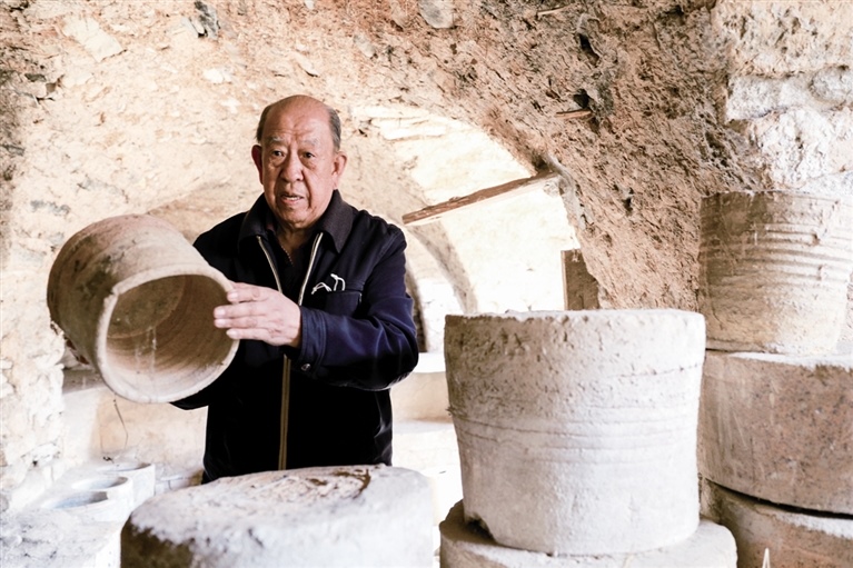 隨后,他走進“饅頭窯”旁邊的一口窯洞,這是當時張家的一間手工作坊,揉泥、拉坯、上釉等一系列制作陶瓷的工序都是在這里完成?!拔揖统錾谶@個村子,已經(jīng)是張家瓷藝的第九代傳人了。作為中國磁州窯譜系,清水河黑礬溝瓷藝生產(chǎn)歷史至少已有800年?!标P(guān)于這項非遺的歷史故事,張選老人向記者娓娓道來:大約400年前,他們張家走西口從山西來到清水河謀生,當時清水河黑礬溝有一家姓杜的人家做陶瓷營生,張家的先人在杜家打工,大概這樣打工做了三輩人吧,杜家忽然不做了,搬離了黑礬溝,他們張家便把杜家的產(chǎn)業(yè)買了下來繼續(xù)做?!澳莻€時候黑礬溝生產(chǎn)的瓷器都與人們生活息息相關(guān),比如腌菜缸、水甕、碗盤等,一個家庭手工作坊一天能生產(chǎn)500個碗呢,生意很好,人們靠做這個營生也過上了不錯的生活。”張選回憶著清水河瓷藝鼎盛時期的場景。上個世紀70年代,由于交通、技術(shù)等原因,黑礬溝燃燒了幾百年的窯火熄滅,傳統(tǒng)“饅頭窯”被正式廢棄,轉(zhuǎn)移到窯溝鄉(xiāng)后手工作坊變成了機械化生產(chǎn),這也讓清水河的陶瓷名聲大噪。當時,在窯溝鄉(xiāng)一帶,從事陶瓷生產(chǎn)的有近萬人,陶瓷業(yè)成為清水河支柱產(chǎn)業(yè)。