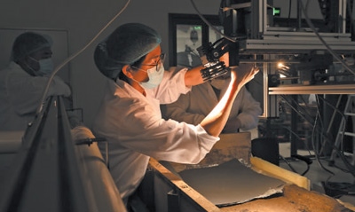 文物修復(fù)四川省文物考古研究院三星堆遺址工作站站長雷雨在查看拼對成功的鳥足曲身頂尊神像。新華社記者 肖 林?jǐn)z