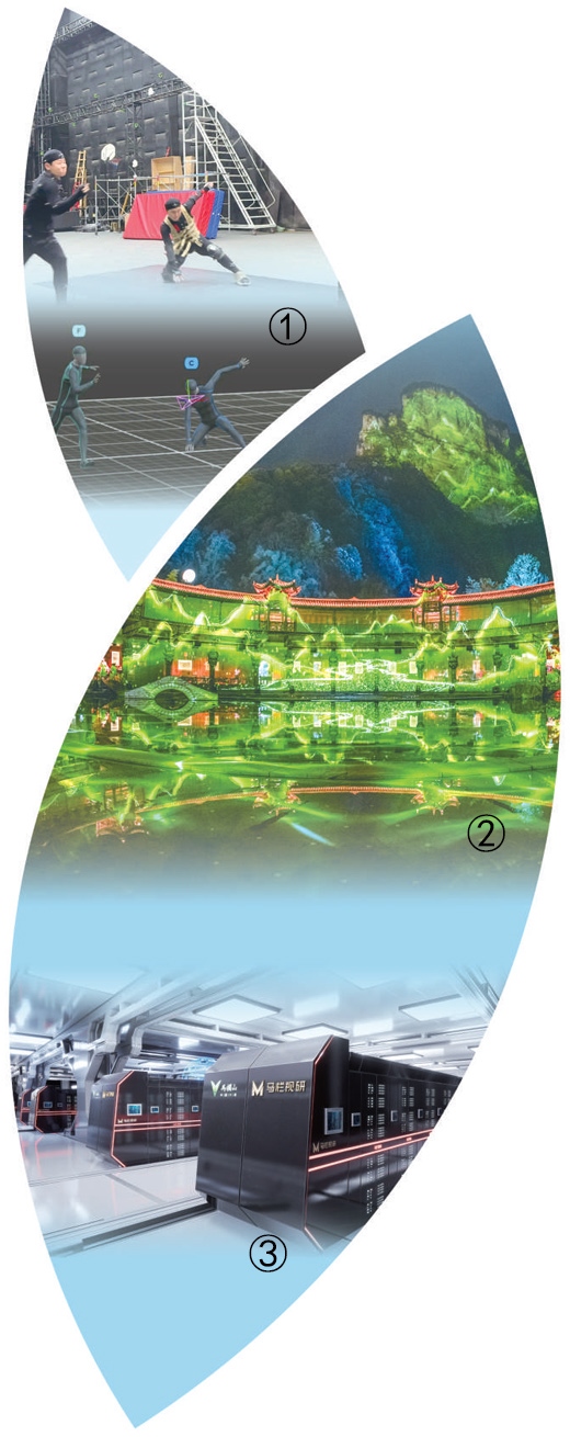 圖①:動捕演員進行高速高精度運動捕捉。 圖②:《德夯幻境》室外大劇場現(xiàn)場。圖③:馬欄山視頻超算中心。以上圖片均為受訪者提供