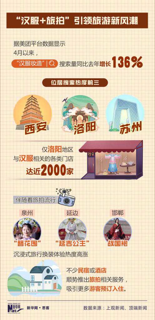 美團平臺數(shù)據(jù)顯示,4月以來,“漢服妝造”搜索量同比增長136%。西安、洛陽等街頭,隨處可見身著漢服的年輕人在博物館、遺址公園等景區(qū)打卡拍照,摩肩接踵間皆是“貴妃”,文博景區(qū)附近不少商鋪以漢服妝造店為主。不少民宿或酒店,順勢推出旅拍服務(wù),吸引更多年輕人預(yù)定入住。