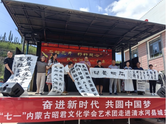 據(jù)了解,本次進社區(qū)活動由內(nèi)蒙古昭君文化學會、清水河縣城關(guān)鎮(zhèn)政府、昆新社區(qū)主辦,活動以“鑄牢中華民族共同體意識,構(gòu)筑中華民族共有精神家園”和慶祝中國共產(chǎn)黨建黨103周年為主旨,以書法、歌舞等群眾喜聞樂見的藝術(shù)形式,歌頌中國共產(chǎn)黨帶領(lǐng)全國各族人民守望相助、團結(jié)奮斗砥礪前行的光輝歷程以及取得的偉大成就,真情詮釋不忘初心,牢記使命的責任擔當。