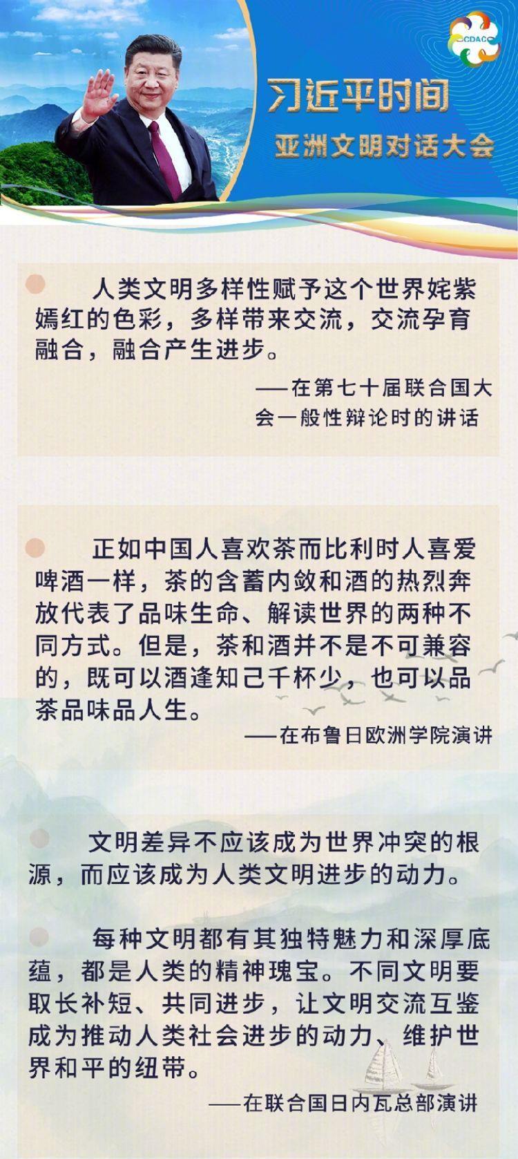 “在漫長歷史長河中,如亞洲的黃河和長江流域、印度河和恒河流域、幼發(fā)拉底河和底格里斯河流域以及東南亞等地區(qū)孕育了眾多古老文明,彼此交相輝映、相得益彰,為人類文明進(jìn)步作出了重要貢獻(xiàn)。今天的亞洲,多樣性的特點仍十分突出,不同文明、不同民族、不同宗教匯聚交融,共同組成多彩多姿的亞洲大家庭。”