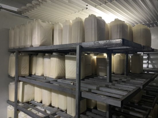 圖為照富經(jīng)貿(mào)有限責(zé)任公司的冷庫(kù),一桶桶從牧戶家收集來的馬奶被整齊排列。